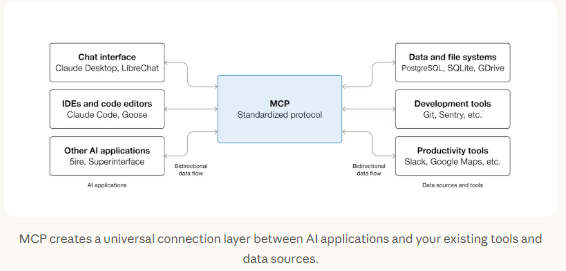 MCP 提供了一种连接到工具和数据源的标准化方式。我们无需为每一种数据源单独构建定制化集成,而是只需基于一个统一的协议进行开发。