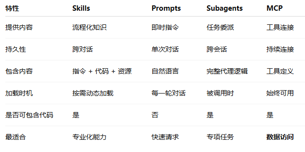 Skills 与 Prompts、MCP 以及 Subagents 之间的对比说明
